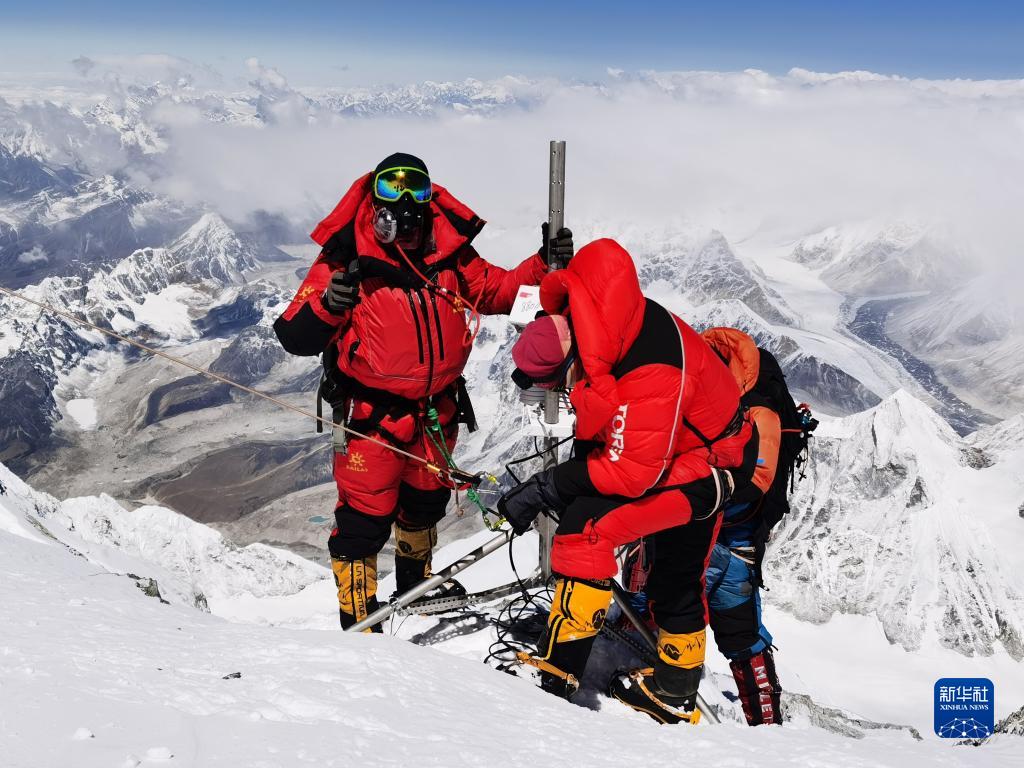 1個(ge) 多小時後,氣象站架設成功。此時,部分隊員已經登上頂峰開展雷達測量雪深、采集冰雪樣品等科研工作。德慶歐珠說,13名科考隊員全部登頂時,珠峰南坡的雲(yun) 慢慢爬上來,隊員們(men) 仿佛站在天上,比雲(yun) 還高。