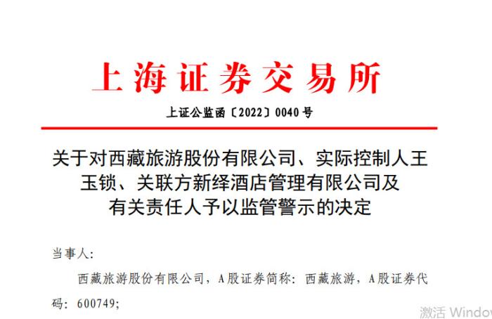據上交所7日消息,因涉及非經營性資金占用,且相關(guan) 信息披露不真實、不準確等,上交所決(jue) 定對西藏旅遊股份有限公司、實際控製人王玉鎖、關(guan) 聯方新繹酒店管理有限公司及有關(guan) 責任人予以監管警示。