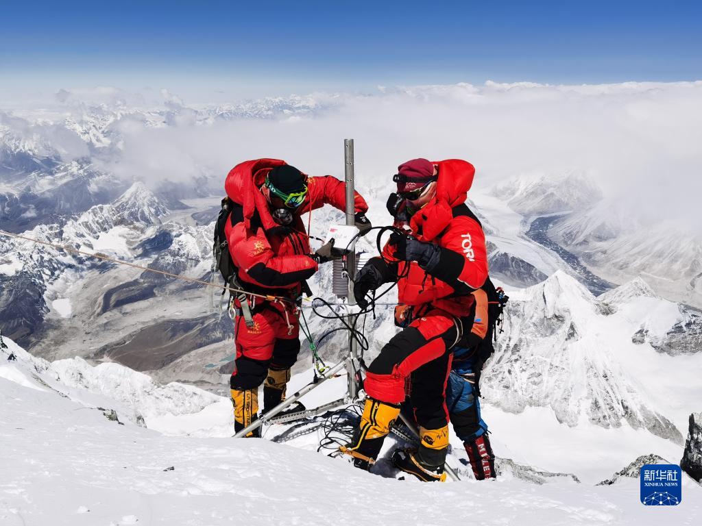 2022年5月4日,科考隊員在珠峰成功架設世界海拔最高的自動氣象站。新華社特約記者 索朗多吉 攝