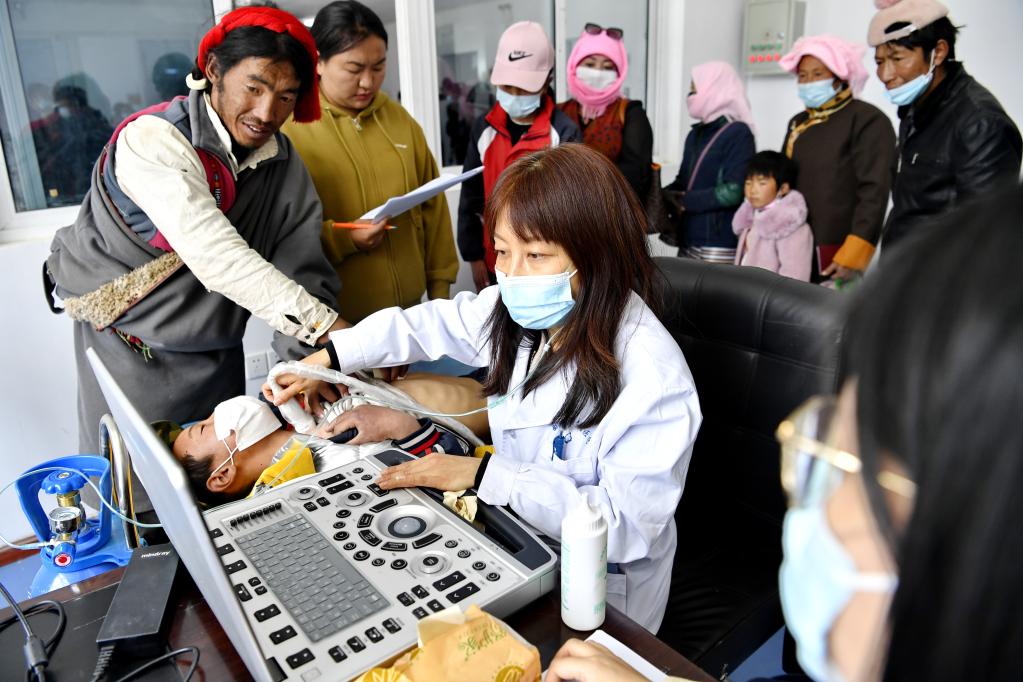 江蘇泰州市人民醫院援藏醫生在拉薩市當雄縣人民醫院為(wei) 一名兒(er) 童做檢查。新華社記者李鍵攝