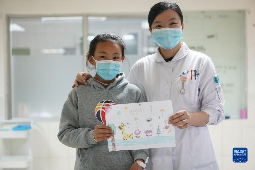 小患者次仁旺姆將自己的畫送給護士湯燕,祝她護士節快樂(le) (5月12日攝)。