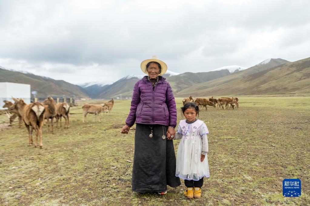 向秋拉姆和孫女在類烏(wu) 齊馬鹿國家級自然保護區內(nei) 合影(5月21日攝)。新華社記者 周荻瀟 攝