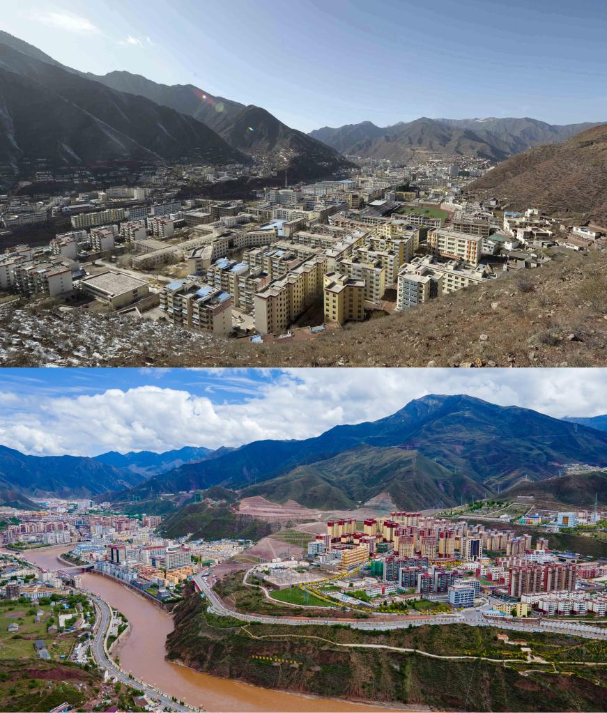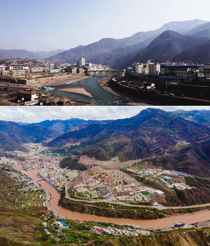 拚版照片:上圖是2009年3月13日拍攝的昌都(新華社記者 普布紮西 攝);下圖是2022年5月22日拍攝的昌都市卡若區(新華社記者 周荻瀟 攝,無人機照片)。新華社發