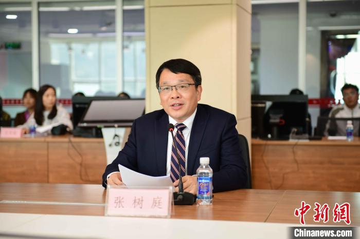 圖為(wei) 西藏民族大學黨(dang) 委常委、副校長,中國傳(chuan) 媒大學黨(dang) 委常委、副校長張樹庭在簽約儀(yi) 式上講話。 貢嘎來鬆 攝