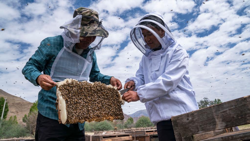 夜伴蜂聲有限公司的技術員(右)正在教授山南市錯那縣覺拉鄉(xiang) 村民普巴占堆蜜蜂養(yang) 殖技術。新華社記者 孫非 攝
