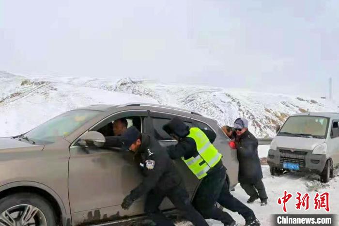 西藏安多交警為(wei) 受困民眾(zhong) 推車。安多縣公安局交警大隊 供圖