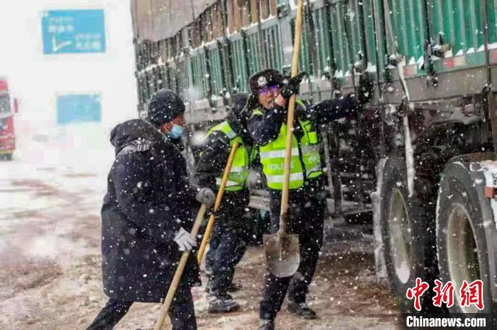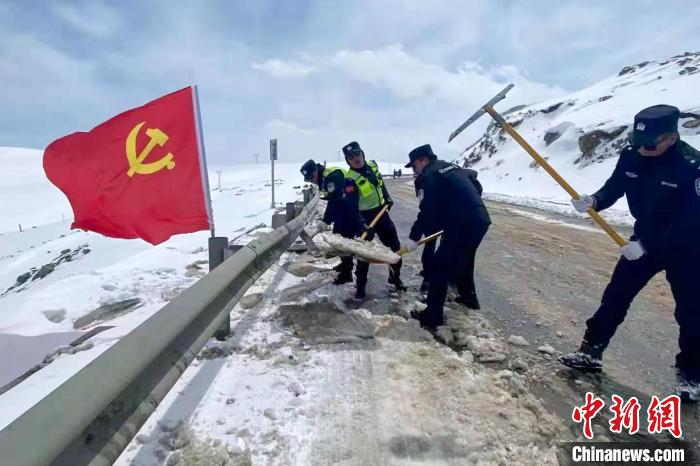 安多交警在唐古拉山埡口清理積雪。安多縣公安局交警大隊 供圖