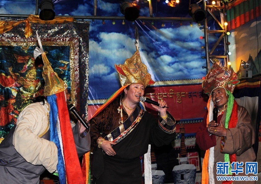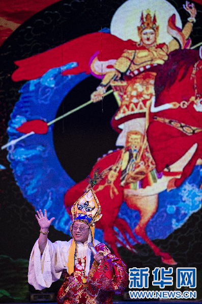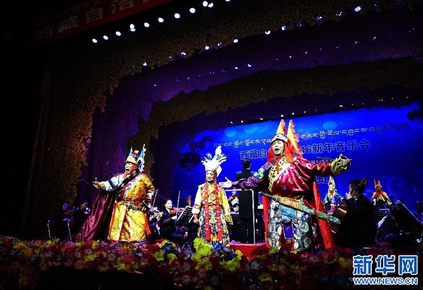 2015年12月30日晚,在拉薩舉(ju) 行的西藏自治區2016年《吉祥彩虹》新年音樂(le) 會(hui) 上,演員表演格薩爾說唱。新華社記者 晉美多吉攝