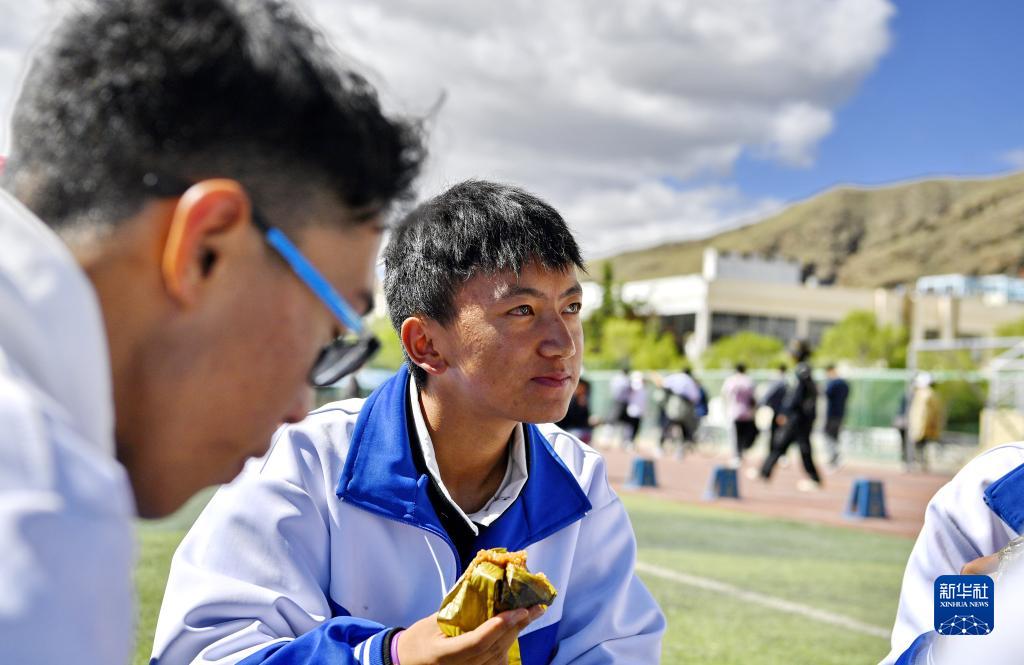 山南市第二高級中學的學生在操場吃粽子(6月3日攝)。新華社記者 劉洲鵬 攝