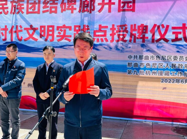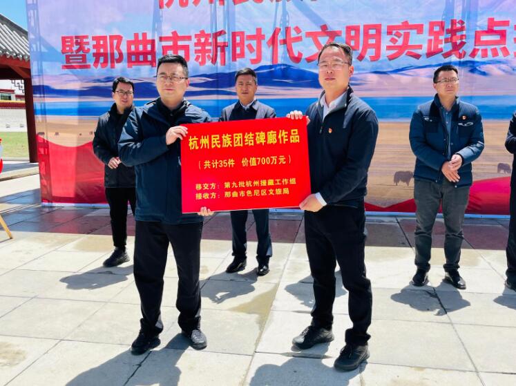 儀(yi) 式上,那曲市委宣傳(chuan) 部決(jue) 定將杭州民族團結碑廊設為(wei) 那曲市新時代文明實踐點,並進行授牌。杭州援藏工作組向色尼區捐贈價(jia) 值700萬(wan) 元的杭州民族團結碑廊書(shu) 法作品。