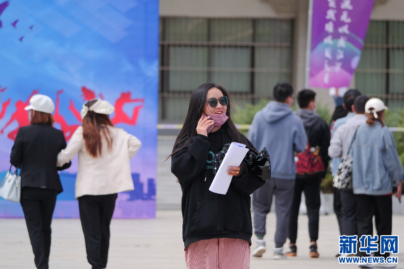 6月15日,應屆畢業(ye) 生在招聘會(hui) 上打電話谘詢。新華網 旦增努布攝