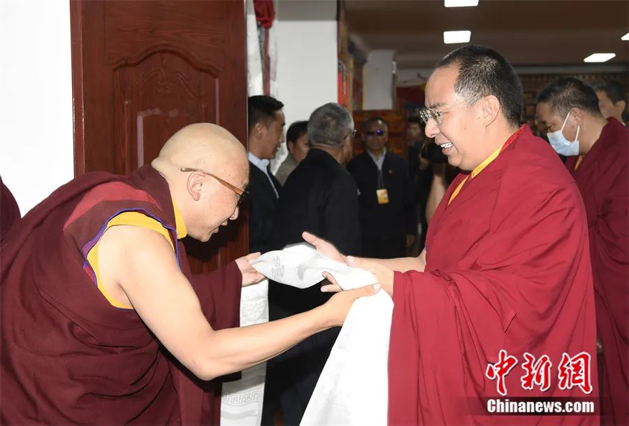 6月2日,班禪與(yu) 藏傳(chuan) 佛教噶舉(ju) 派高僧座談前,噶舉(ju) 派高僧向班禪(圖右)敬獻哈達。中新社發 李林 攝