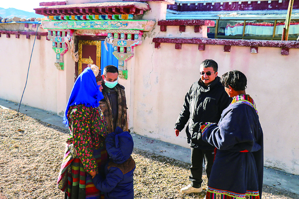 王軍(jun) 強(右二)在巴紮鄉(xiang) 結對幫扶達吉家中了解生活情況。