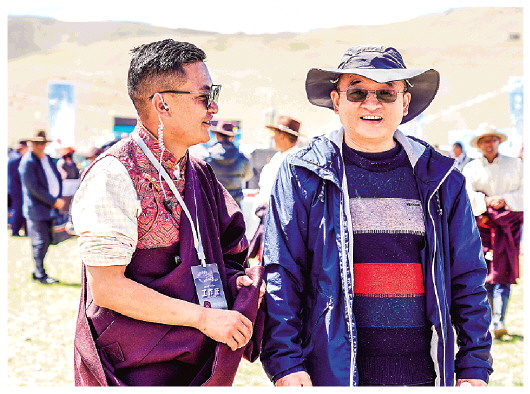 2021年7月,王軍(jun) 強(右)在賽馬節上與(yu) 索朗倫(lun) 布談話。
