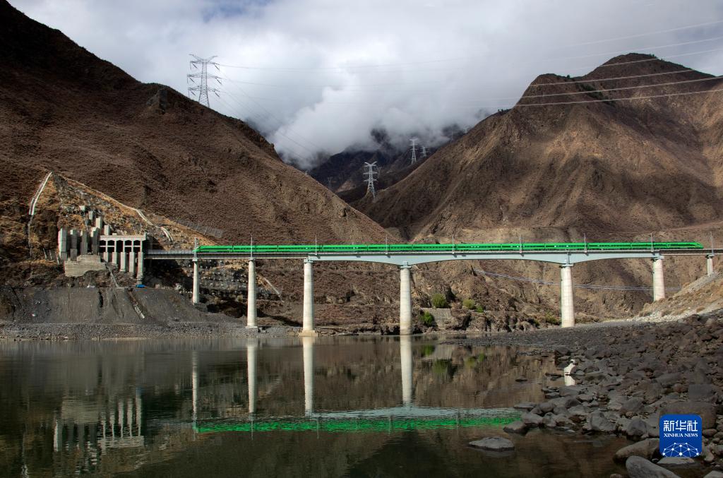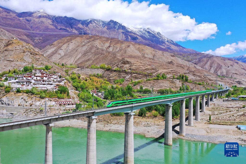 4月14日,複興(xing) 號列車行駛在西藏朗縣境內(nei) 的雅魯藏布江上。新華社記者 覺果 攝