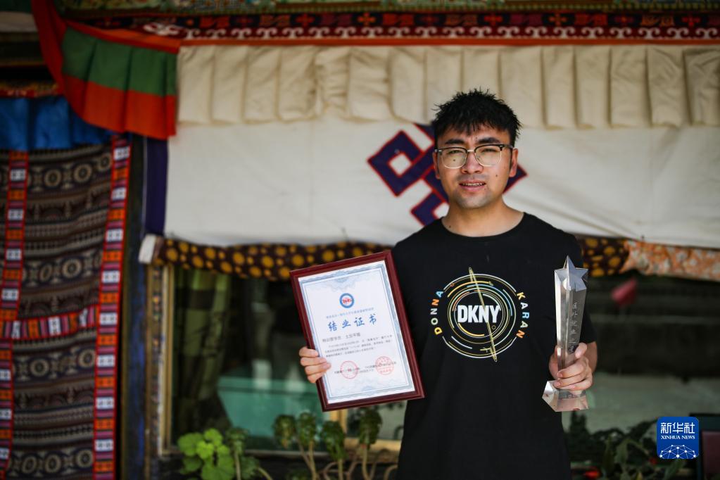 “格桑花開”大學生就業(ye) 創業(ye) 特訓營學員、江蘇今世緣酒業(ye) 股份有限公司甘青藏大區業(ye) 務經理土旦平措展示特訓營結業(ye) 證書(shu) 和“區外就業(ye) 之星”獎杯(2022年6月23日攝)。新華社記者 薑帆 攝