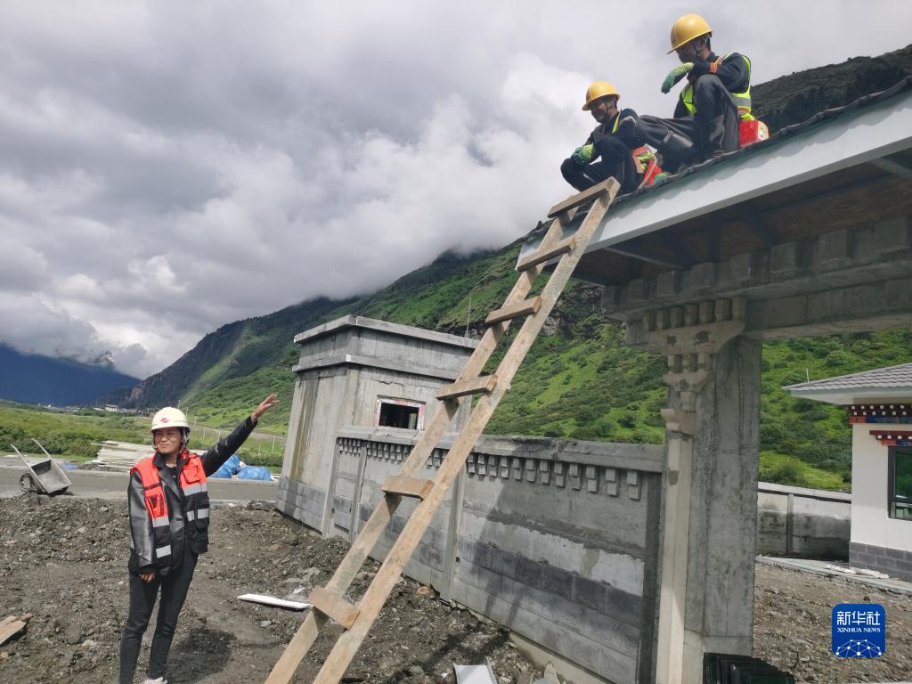“格桑花開”大學生就業(ye) 創業(ye) 特訓營學員、西藏藏建科技股份有限公司職員阿吉卓瑪(左)在施工現場工作(2022年6月28日攝)。