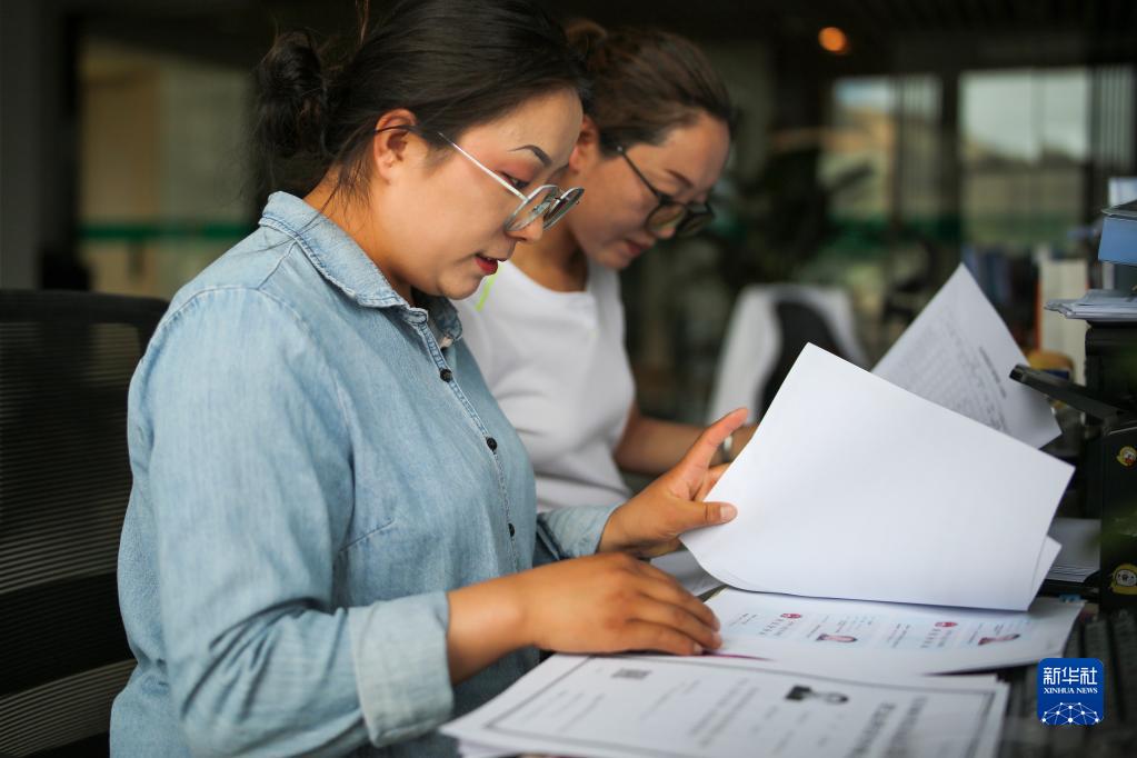 “格桑花開”大學生就業(ye) 創業(ye) 特訓營學員、西藏藏建科技股份有限公司職員次仁瓊達(左)在工作(2022年6月24日攝)。新華社記者 薑帆 攝