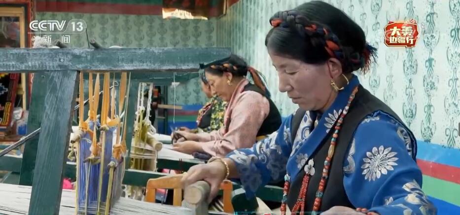 崗巴縣崗姆衝(chong) 農(nong) 民專(zhuan) 業(ye) 合作社負責人 央拉姆:我們(men) 這裏有卡墊、靠背、氆氌、邦典。這個(ge) 叫邦典,我們(men) 就這樣戴的。