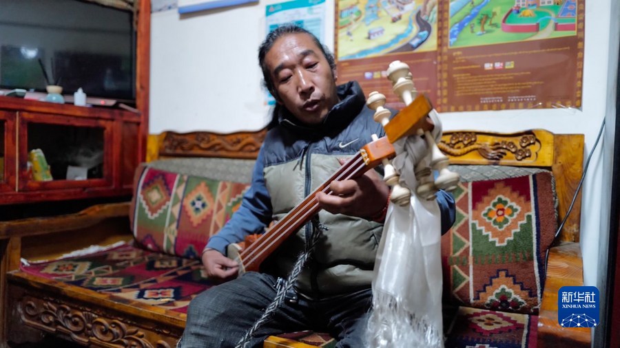 絨轄鄉(xiang) 居民紮西次仁在位於(yu) 陳塘村的自家甜茶館裏彈奏紮念琴(4月10日攝)。新華社記者 劉潁 攝