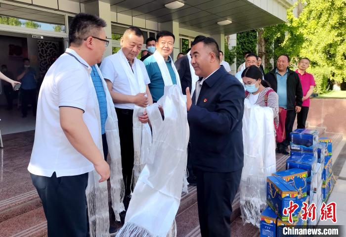 圖為(wei) 日土縣縣長達瓦次仁為(wei) 考察團一行獻哈達。日土縣縣委供圖