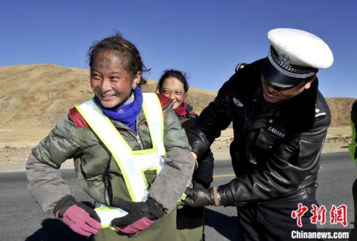西藏交警為(wei) 朝佛信眾(zhong) 發放反光背心保障安全。中新社發 李林 攝