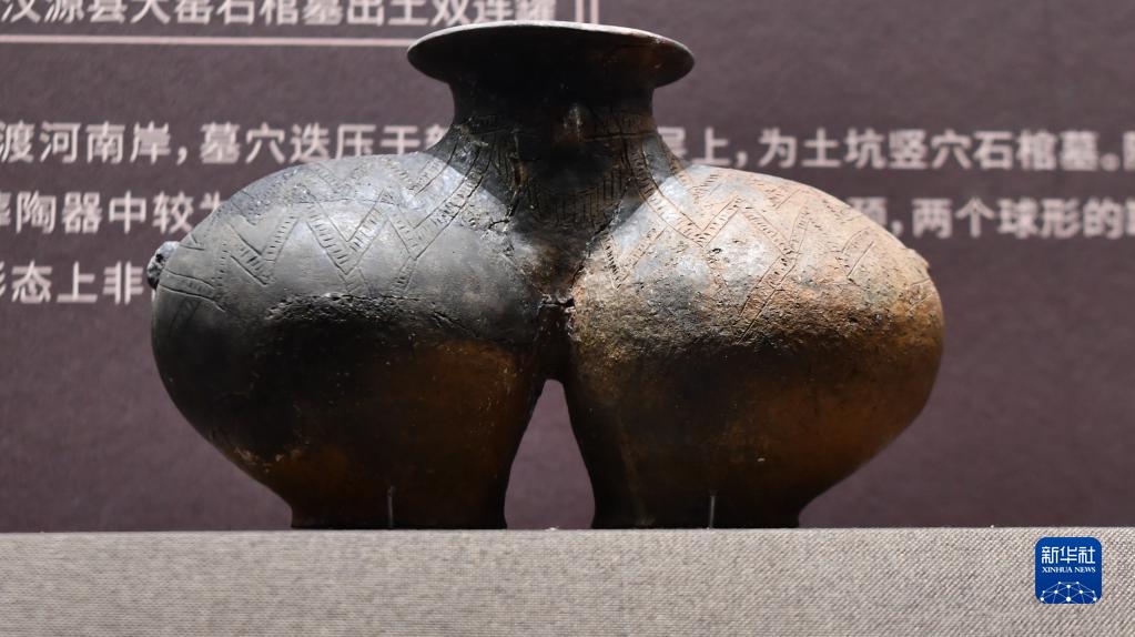 這是6月29日拍攝的西藏博物館收藏的雙體(ti) 陶罐。該陶罐出土於(yu) 西藏昌都卡若遺址,是新石器時代西藏陶器的代表作。新華社記者 晉美多吉 攝