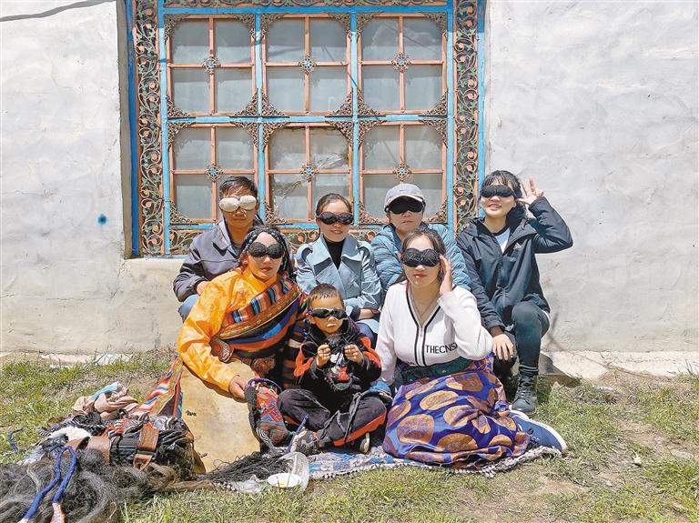 圖為(wei) 次仁曲吉(左一)家中,次仁曲吉及其家人與(yu) 記者一行佩戴上“安多眼罩”合照留念。萬(wan) 靖 高玉潔 攝