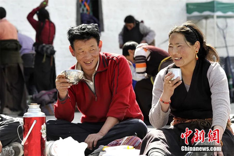 2012年3月,西藏拉薩,民眾(zhong) 在大昭寺廣場上邊喝酥油茶邊聊天。中新社記者 李林 攝