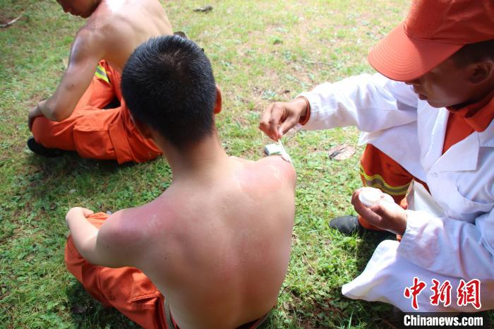 圖為(wei) 為(wei) 曬傷(shang) 的隊員及時救治。 林芝市森林消防支隊供圖