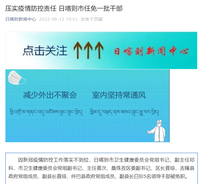 據日喀則新聞中心微信公眾(zhong) 號消息,因新冠疫情防控工作落實不到位,日喀則市衛生健康委員會(hui) 黨(dang) 組書(shu) 記、副主任鄧科,市衛生健康委員會(hui) 黨(dang) 組副書(shu) 記、主任普次,桑珠孜區委副書(shu) 記、區長普瓊,吉隆縣政府黨(dang) 組成員、副縣長普瓊,仲巴縣政府黨(dang) 組成員、副縣長白珍5名領導幹部被免職。