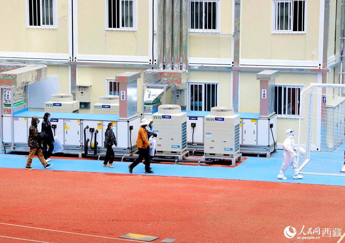 艙外指定區患者跟在醫護人員身後去做檢查。人民網 次仁羅布 攝