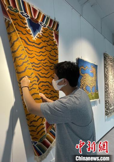 展廳中央地板上,90*190厘米的各色藏毯相連鋪開,這是藏族民眾(zhong) 最常用的、鋪在床鋪上的尺寸;兩(liang) 旁牆上,懸掛多幅圖案複雜精細的大尺寸掛毯,這是重於(yu) 藝術性的現代創作:好似唐卡的財寶天王掛毯、讓人有油畫錯覺的珠穆朗瑪峰風景掛毯……另有一張長逾1米的虎毯,主色深黃、虎紋考究,上下兩(liang) 端織有七彩紋飾,非常搶眼。若將虎毯翻轉,還會(hui) 發現反麵亦是清晰齊整的虎紋,與(yu) 正麵幾無差異。