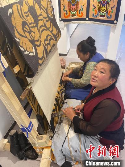 圖為(wei) 在展廳中兩(liang) 位藏族阿佳正一邊編織藏毯,一邊經過工作人員翻譯與(yu) 觀展者聊天。李晗雪 攝