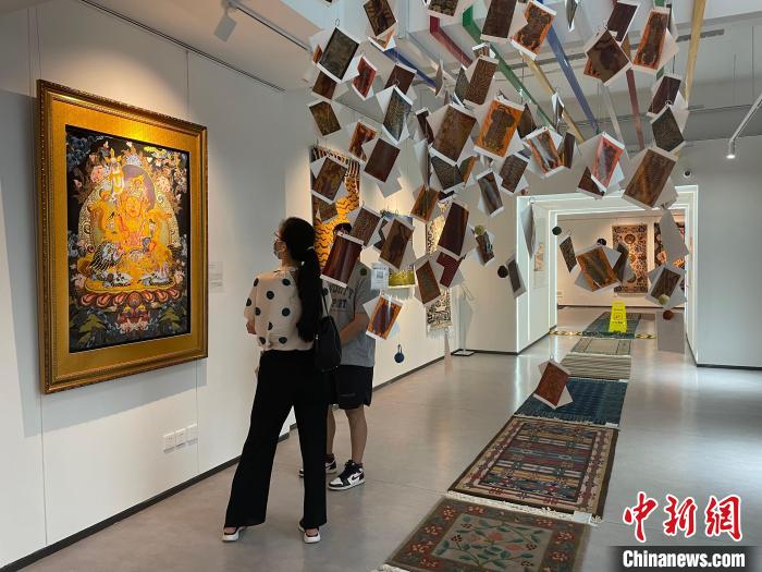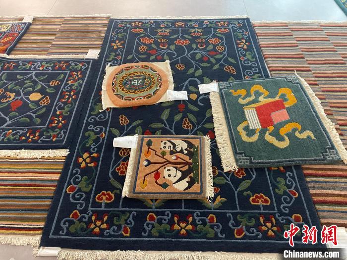 圖為(wei) 展廳中展示的傳(chuan) 統藏毯及創新設計的坐墊大小的藏毯。李晗雪 攝