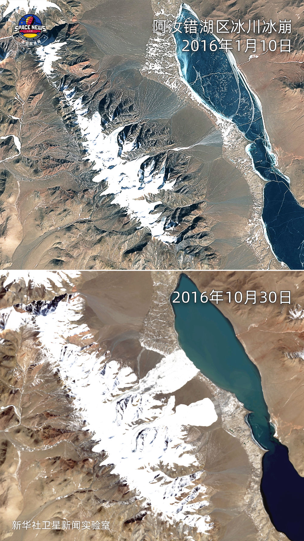 西藏阿裏阿汝錯湖區,2016年7月和9月先後發生兩(liang) 次大型冰崩災害,冰崩體(ti) 攜帶大量碎屑物質,滑動約8公裏後衝(chong) 入阿汝錯,在湖岸留下兩(liang) 個(ge) 巨大的冰崩扇。