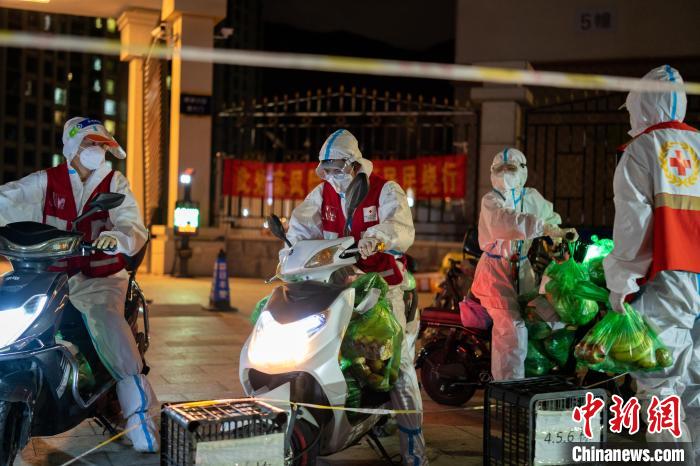防疫誌願者逐個(ge) 為(wei) 居民派送蔬菜水果等生活物資。江飛波 攝
