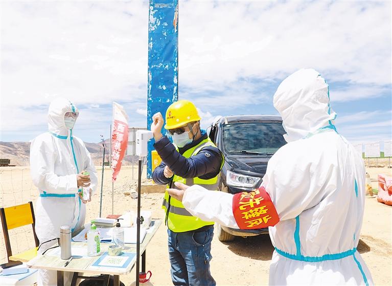在西藏阿裏普蘭機場項目施工現場,施工人員經過體溫檢測、身份登記、消毒等程序後,才能進入工地。[詳細]