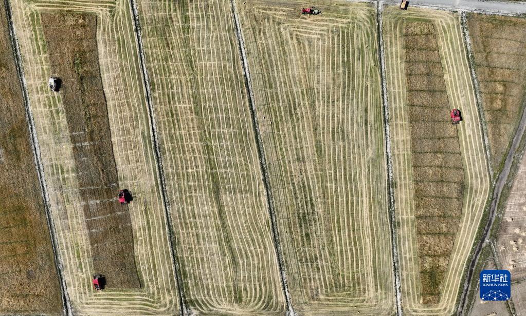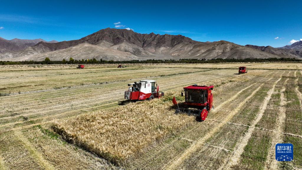 西藏日喀則市江孜縣熱索鄉(xiang) 努康村農(nong) 機合作社的村民集中對村裏三千多畝(mu) 耕地進行機械化收割(9月19日攝,無人機照片)。新華社記者 晉美多吉 攝