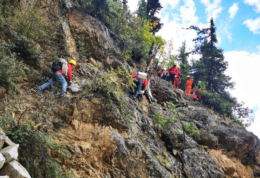 9月17日,電力施工人員正在懸崖峭壁間運輸工器具。次仁桑布攝