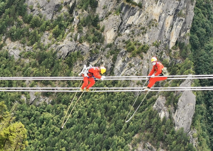 9月15日,電力檢修人員開展左波線米堆冰川段導線扭絞處理走線作業(ye) 。旦尼攝