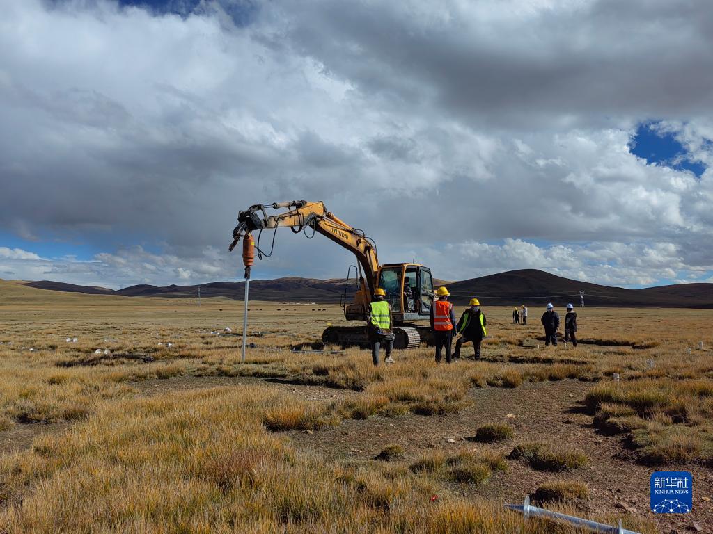 在西藏華電那曲色尼區12萬(wan) 千瓦光伏發電電力保供項目工地,工人們(men) 正安裝螺旋樁。(受訪單位供圖)