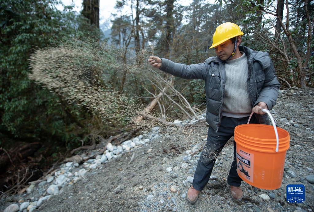 工人在派墨公路沿線撒播植物種子(2021年3月11日攝)。新華社發(董誌雄 攝)