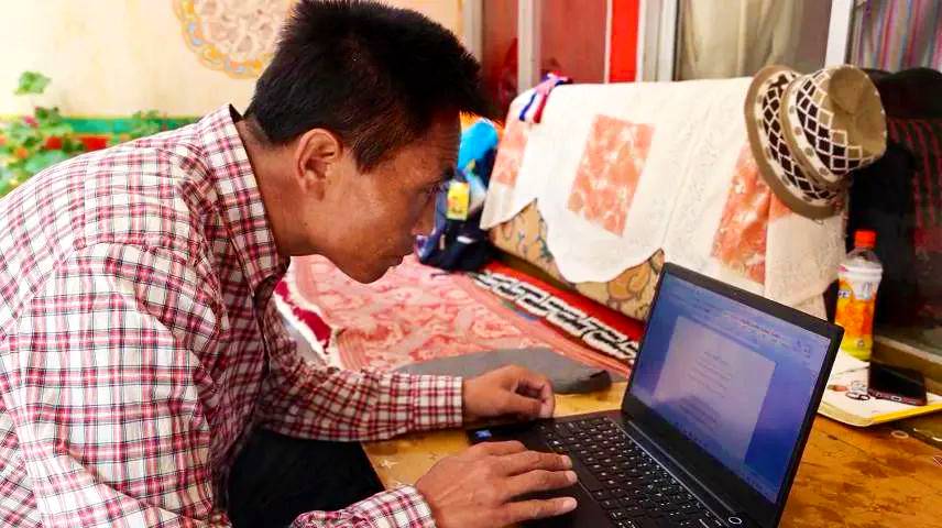 一位農(nong) 民在電腦前練習(xi) 打字。新科技已經漸漸引進了農(nong) 村,農(nong) 村的很多家庭置辦了電腦,農(nong) 民也開始學會(hui) 了上網。