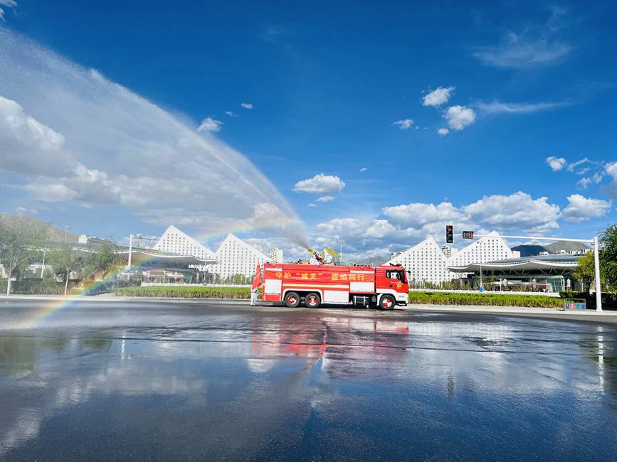 2022年8月13日,一條《彩虹下的心願,願疫情早日退去》的視頻刷爆拉薩市民的朋友圈,視頻中消防指戰員化身“大白”,逆行而上,在拉薩主城區以社區網格為(wei) 基本單位開展消殺。當天,消防車30輛、指戰員146人集體(ti) 出動,噴灑而出的消毒液在陽光下形成了一道道彩虹。