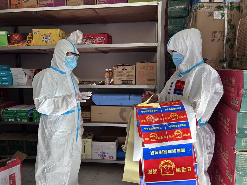 圖為(wei) 日喀則支隊後勤管理員李萬(wan) 樂(le) (右一)與(yu) 醫療、生活物資保供單位聯係,調集防疫物資。
