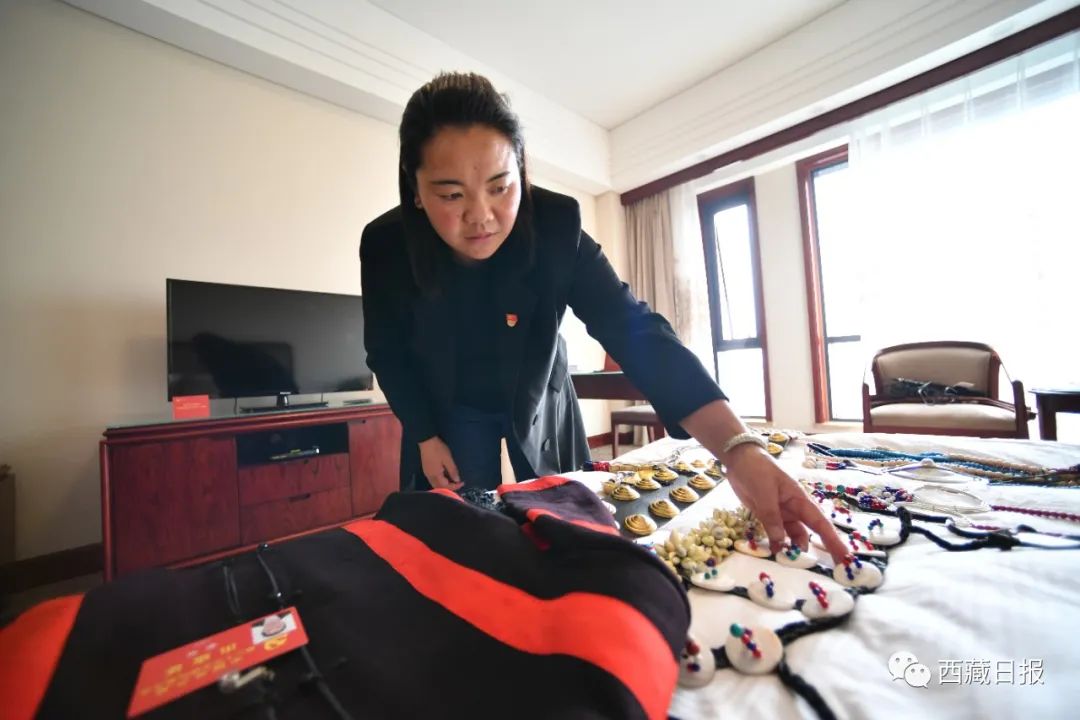 這是亞(ya) 夏代表在整理出席大會(hui) 穿的珞巴民族服裝。記者 旦增西旦 攝