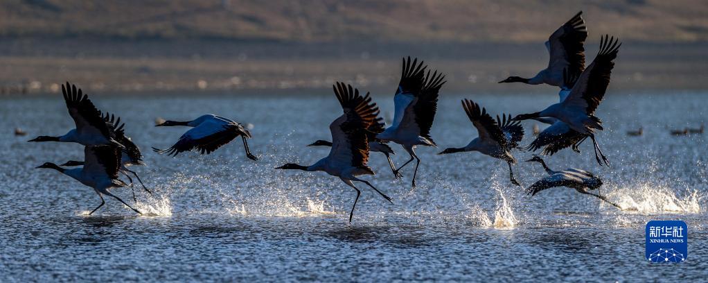 在林周縣虎頭山水庫拍攝的黑頸鶴(11月6日攝)。新華社記者 薑帆 攝