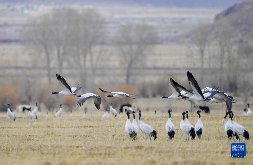 林周縣強嘎鄉(xiang) 田野裏的黑頸鶴(11月6日攝)。新華社記者 張汝鋒 攝