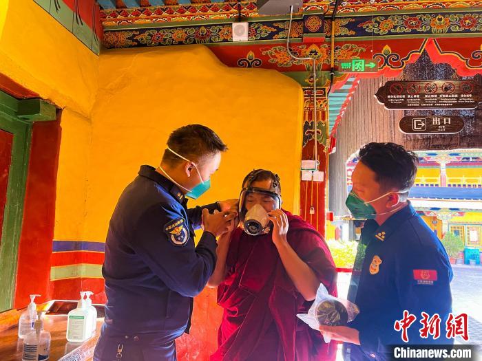 圖為(wei) 消防員指導僧人學習(xi) 佩戴防煙防毒麵具。 拉薩市消防救援支隊供圖